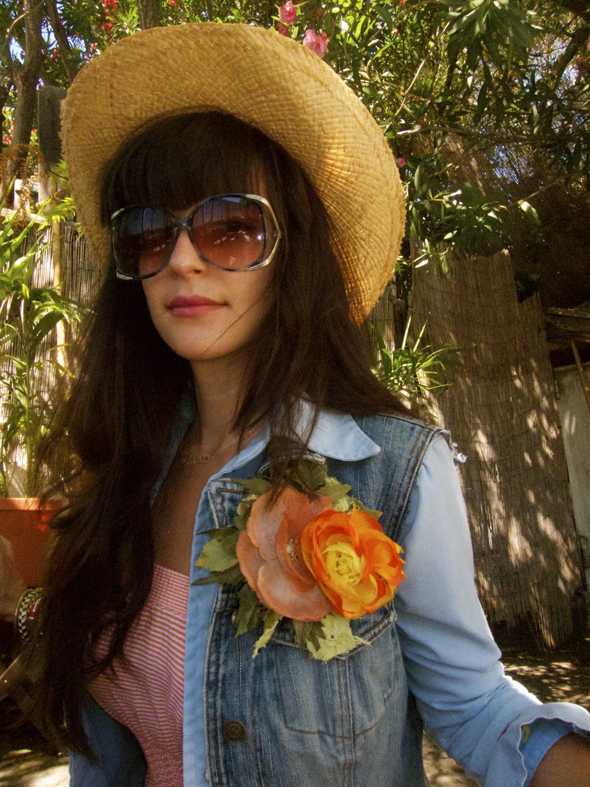 (collared shirt, shades and boots: vintage, dress: gift from my mama, vest: altered Paris Blues embellished with various silk and fabric flowers, hat: (embarrased to tell you) Mary Kate and Ashely Olson)